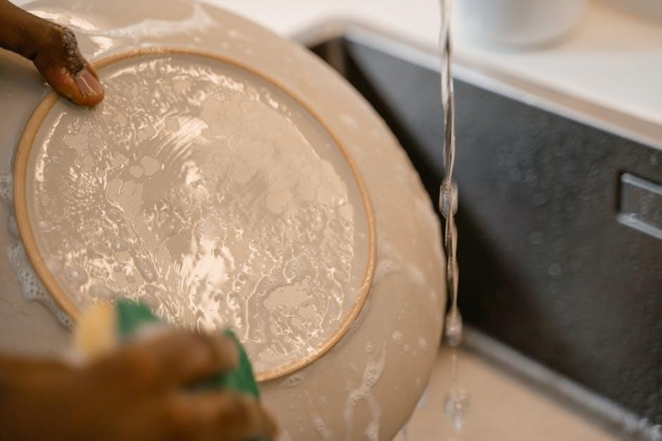 Rinse aid is equally vital, functioning as a final ‘data refinement’ step. It reduces water spots and enhances drying. Regularly refill the rinse aid dispenser to maintain optimal performance. Proper detergent and rinse aid usage ensures spotless dishes and efficient operation.